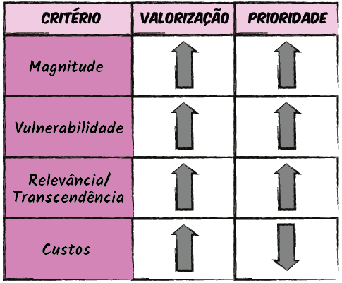 A magnitude, a relevância/transcendência e a vulnerabilidade devem ser interpretadas de forma direta, isto é, quanto maior a valoração desses critérios, maior é a prioridade conferida à intervenção. Já o custo é inversamente proporcional, ou seja, quanto maior o custo da intervenção, menor a possibilidade de a solução ser priorizada.
