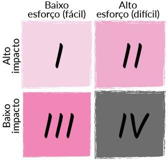 Devemos fazer um levantamento das tarefas a serem executadas e, em seguida, distribuí-las, considerando a energia ou o esforço despendido (horizontalmente) e o resultado ou impacto representado (verticalmente) para cada ação.