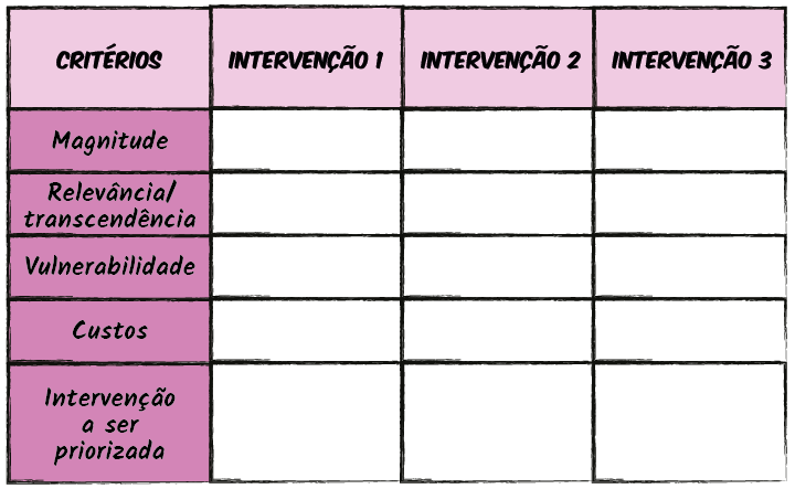 Ao aplicar os critérios para comparar intervenções, deve-se sinalizar a que for mais valorada em cada um. Na priorização, prevalece a combinação de critérios. Serão consideradas prioritárias as intervenções que obtiverem o maior número de critérios sinalizados, exceto o de custos. Toda atenção deve ser dada à relação inversa entre os critérios de magnitude, os de vulnerabilidade e os de relevância com os de custos. Esteja sempre atento a essa relação inversa (Quadro 2).