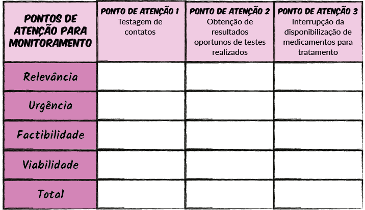 Perceba que a relevância do ponto de atenção testagem de contatos é fundamental para evitar a reinfecção do caso. A urgência, principalmente em gestantes, interrompe a transmissão de mãe para filho (transmissão vertical). As ações de testagem estão previstas no pré-natal, tendo alta factibilidade. Entretanto, a viabilidade do estágio de contato é influenciada por fatores de contexto, que incluem desde a violência urbana e de gênero até o estigma de associar a sífilis à “doença de rua”. Esse tipo de análise deve ser realizado na priorização para cada ponto de atenção.