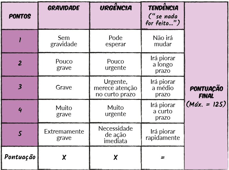 Nessa matriz, é atribuída uma pontuação para cada problema (Quadro 1) e, posteriormente, os valores dados a cada atributo deverão ser multiplicados entre si (G*U*T). Aquele problema que obtiver a maior pontuação demanda prioridade na sua resolução, visto que é mais grave, mais urgente e com uma tendência a se tornar pior (BRASIL, 2019).