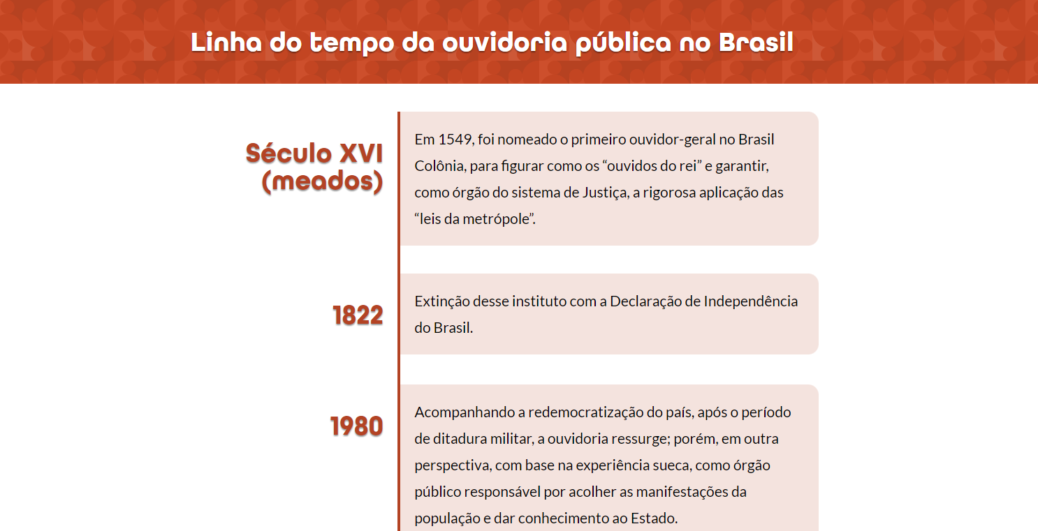 Desde a época do Império, há relatos da existência da ouvidoria no Brasil, com a nomeação do primeiro ouvidor-geral e, ao longo da história, ocorreram diversas mudanças até chegar ao que temos hoje instituído como ouvidoria pública no país.