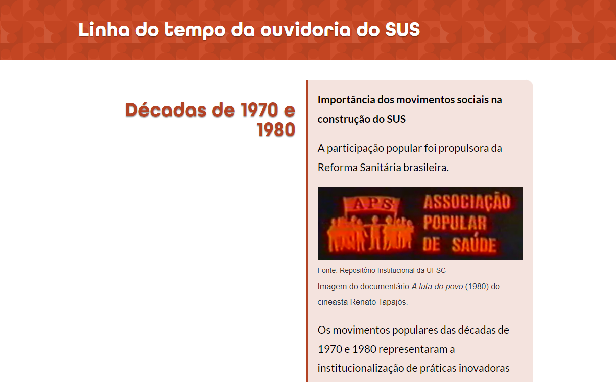 Vocês percorreram, por meio da linha do tempo, a evolução das ouvidorias no Brasil como instrumentos de participação social na administração púbica. Além disso, conheceram marcos importantes da história do SUS que contribuíram para a estruturação das ouvidorias de saúde. Agora vamos refletir um pouco mais sobre a importância da ouvidoria como espaço institucional da participação social para garantia do acesso às informações e do direito à saúde. Acesse o próximo módulo.