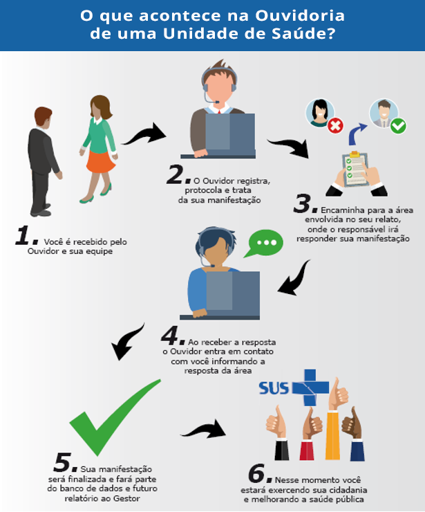 Na área da saúde, as ouvidorias do SUS são as instâncias especializadas responsáveis por acolher as manifestações dos usuários dos serviços do SUS. Elas são as interlocutoras no processo de captar as demandas do cidadão e encaminhá-las à área responsável. Nesse fluxo, as ouvidorias do SUS devem ser capazes de avaliar a satisfação do cidadão com os serviços de saúde prestados pelo SUS, conhecendo as maiores problemáticas. Essas, por sua vez, precisam ser repassadas para as áreas competentes pela formulação e implementação das políticas públicas de saúde.